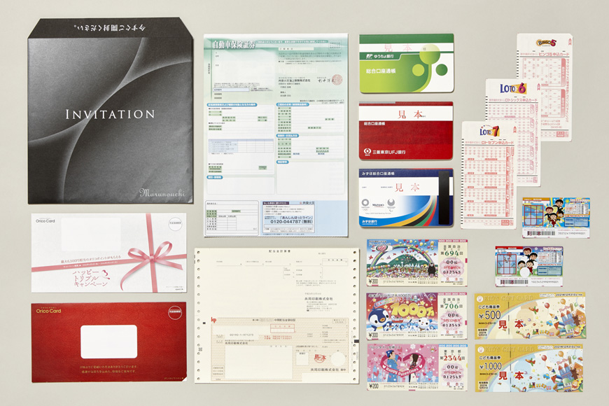 データプリントサービス、BPOサービス、ビジネスフォーム、通帳、抽せん券、商品券、乗車券、定期券、ICカード、クレジットカード、その他各種カード