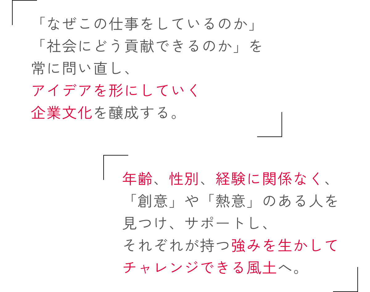 - 人材こそが競争力の源泉という思いを持っています。人が挑戦し、動かなければ会社は変わりません。私たちの事業は、いわゆる“モノづくり”と“コトづくり”の両面を持っています。だからこそ、社員一人ひとりの「創意」と「熱意」が不可欠なのです。