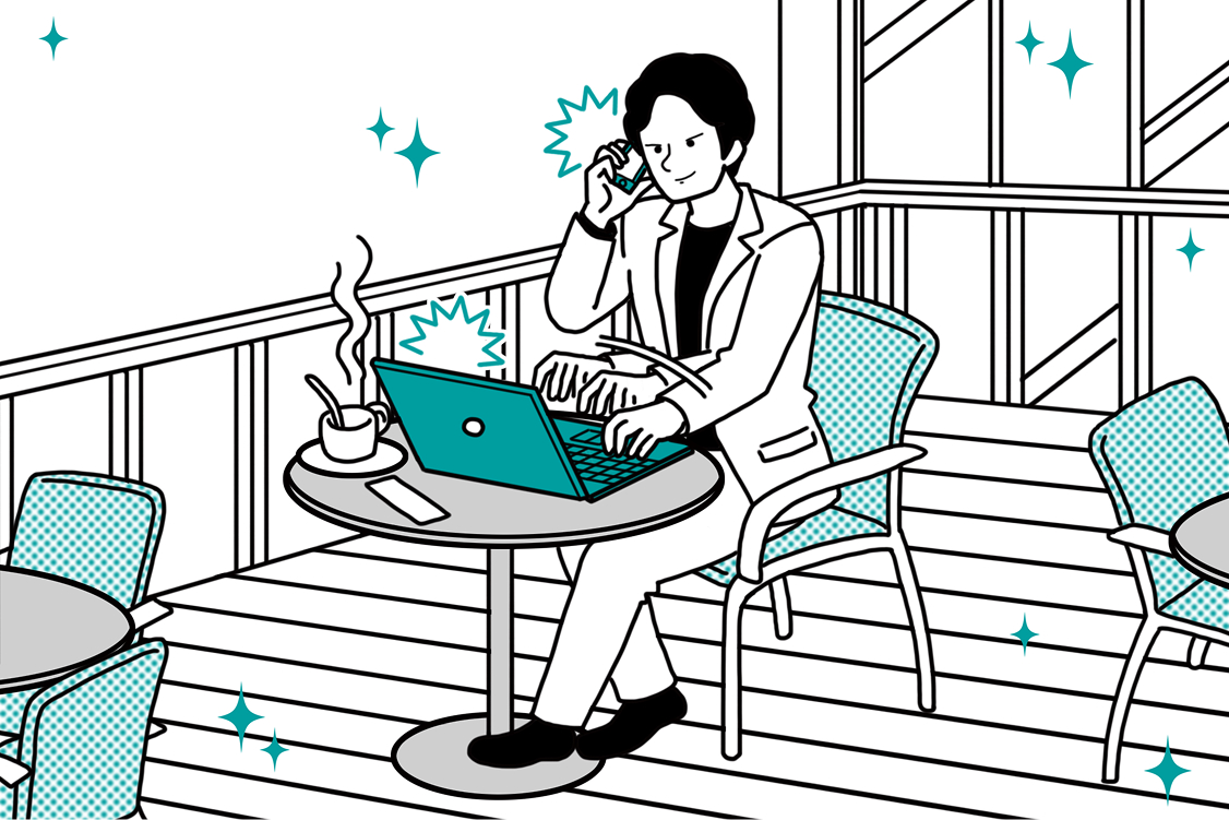 移動の多い日は、都内各所にあるサテライトオフィスを利用してタスクをテキパキこなします。コーヒーを飲みながら、メール連絡&オンライン会議。刷り見本の運搬も携帯電話で依頼が完結。リモート環境が整っているので、場所に縛られず効率的に働けていると実感します。