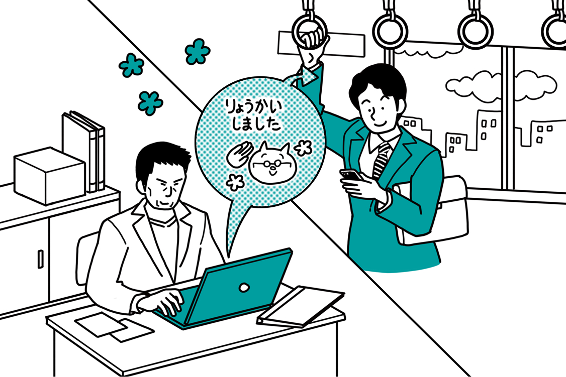 社内の連絡は、ビジネスチャットアプリを使用。移動中に発生した急ぎの用件も、チャットですばやくチームに連携。コワモテ上司から、意外にも、ゆるふわな可愛いスタンプで返事がくることも!?日々のビジネスコミュニケーションが気軽にできて、風通しがよい職場だと感じています。
