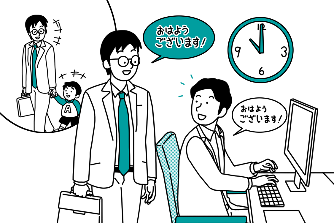 早朝ランで汗を流して、朝風呂にゆったり入って…。身も心もすっきりしてから、10:00に出勤。オフピーク出勤の導入により、通勤ラッシュで人に揉まれて始業前にはぐったり…なんてことも少なくなりました。一日の始まりは快適に過ごして、仕事のパフォーマンスもアップ!