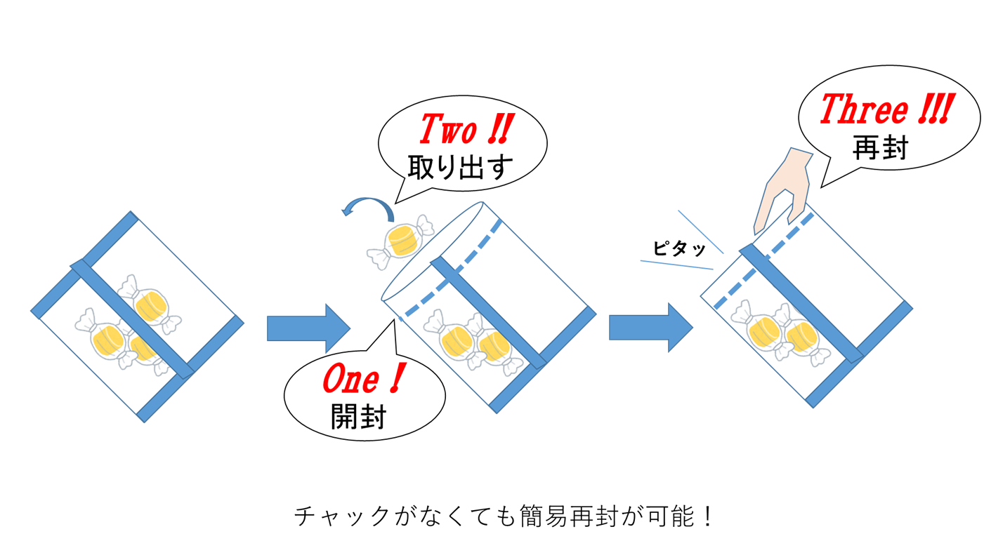 当社はチャック不要のリシール可能なパウチを開発しました。これまで、一度開封した袋に再封機能を付与するためには別途チャックなどの取り付けが必要で、コストの関係から食品用軽包装への導入が進んでいません。そのため、消費者は包材の開封口を輪ゴムやテープを使って閉じる必要があります。