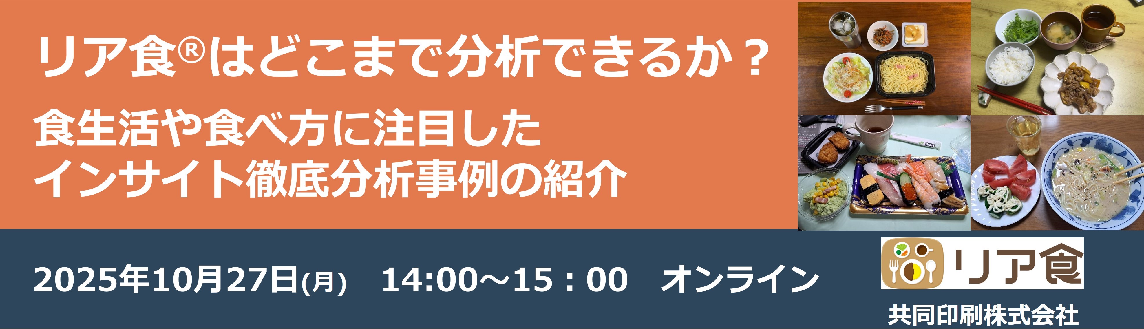 共同印刷株式会社(本社:東京都文京区、代表取締役社長:大橋輝臣 以下:当社)が運営する「リア食®」の無料ウェビナーを10月27日に開催します。「リア食」は食卓画像および画像に紐付いた情報をマーケティングデータとして販売するサービスで、同サービスとしては国内最大級の規模です。