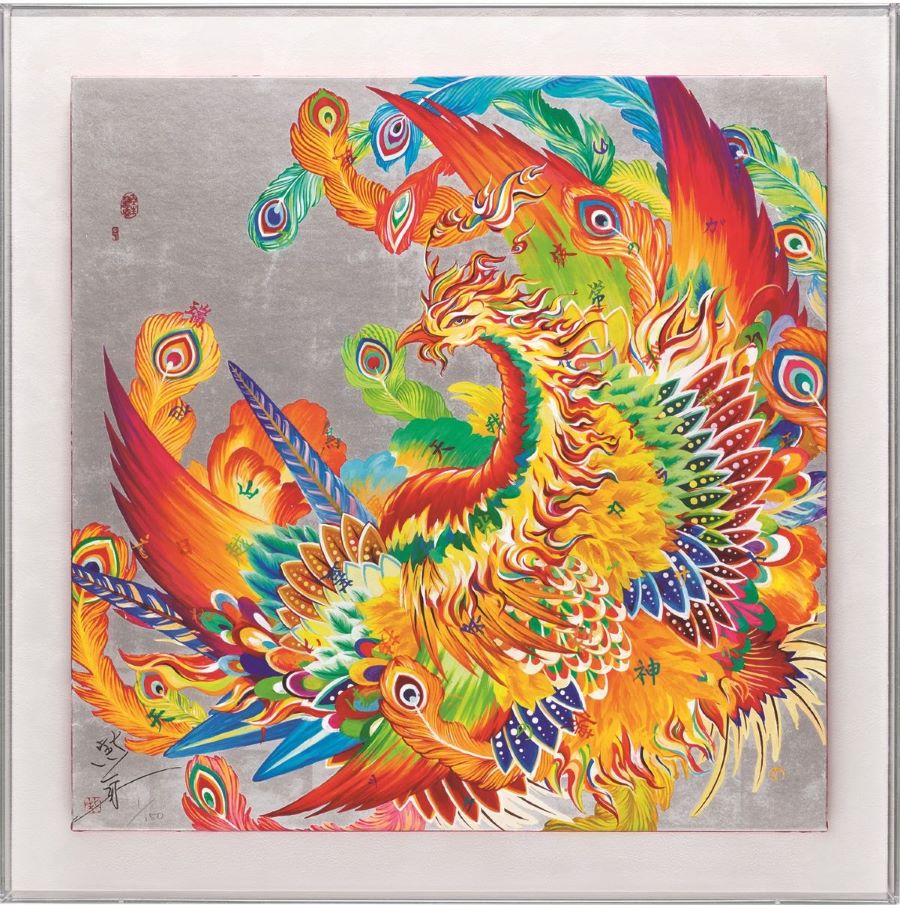 本作品は紫舟監修のもと、原画独特のしっとりとした光沢感や、花が開いたかのような火の鳥の色彩の美しさと、背景の重厚感ある本銀箔の陰影を、高精度のデジタルプリントとシルクスクリーンによる加色、銀の箔で表現しました。ぜひお手元でお楽しみください。
